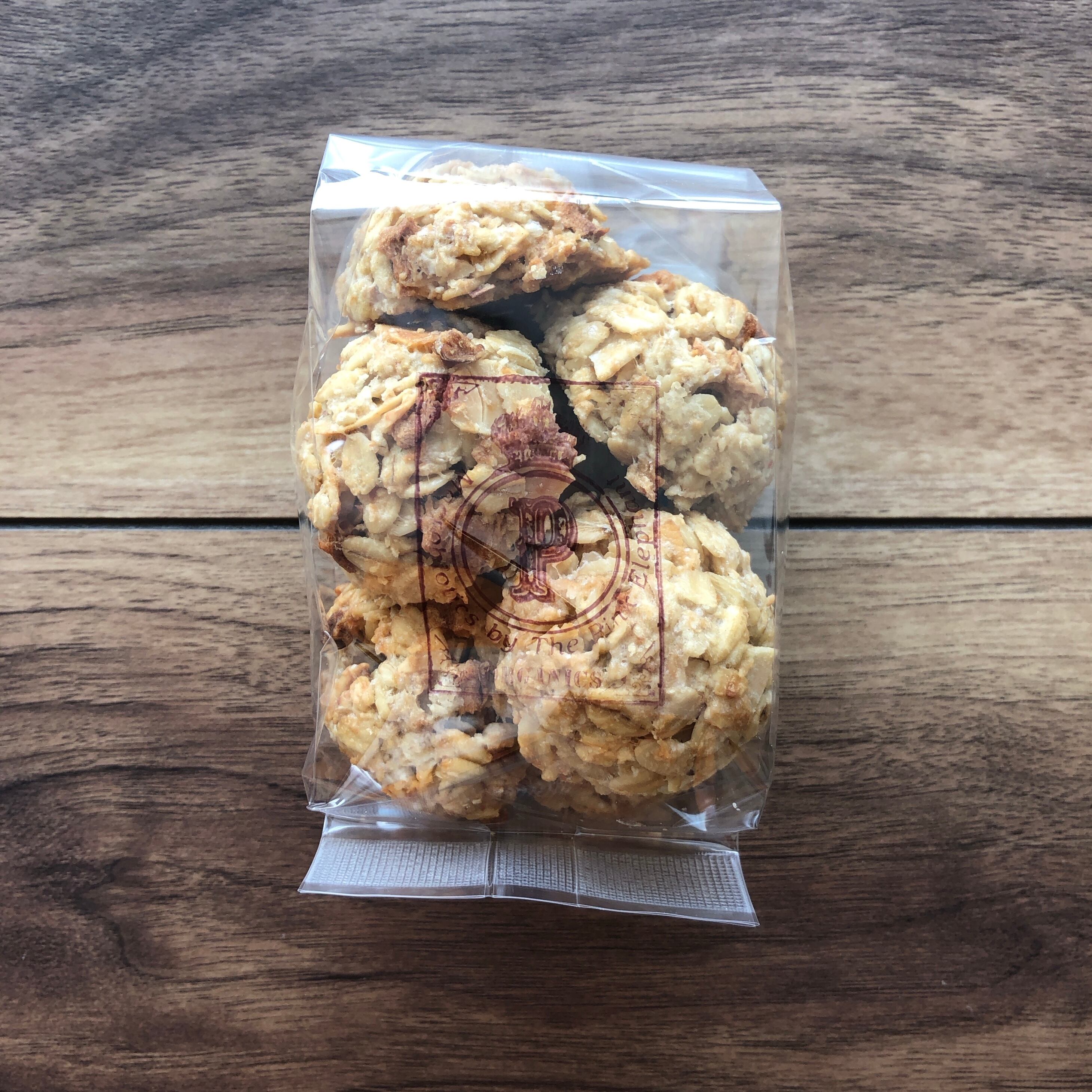 有機オートミール、小麦粉(北海道)、きび糖(鹿児島)、菜種油(遺伝子組換えでない)、アーモンド、有機りんご、有機レーズン、有機ココナッツ油、有機ココナッツ(無漂白)、食塩(海の精)